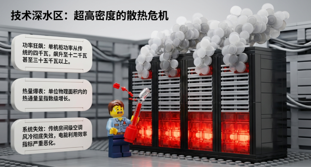 近年來,大模型訓(xùn)練需求的激增徹底改變了數(shù)據(jù)中心的硬件形態(tài)。傳統(tǒng)的通用數(shù)據(jù)中心單機柜功率普遍停留在4kW至6kW的舒適區(qū)間,然而,面對搭載高性能AI加速卡的高密服務(wù)器,新建智算中心的單機柜功率已經(jīng)狂飆突進至12kW、21kW甚至單機柜超35kW的恐怖密度。功率密度的急劇上升使得單位物理面積內(nèi)的熱通量呈指數(shù)級增長。