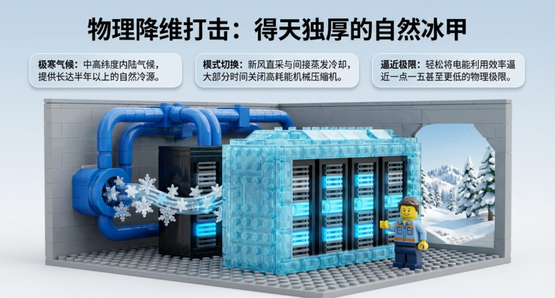 這正是內(nèi)蒙古在工程物理層面形成降維打擊的核心所在。內(nèi)蒙古地處中高緯度內(nèi)陸,全年平均氣溫極低,具備長達半年以上可直接利用的自然冷源。通過引入新風(fēng)直采或間接蒸發(fā)冷卻等先進暖通技術(shù),內(nèi)蒙古的數(shù)據(jù)中心在一年中的絕大部分時間里可以完全關(guān)閉高耗能的機械壓縮機,僅依靠大自然的冷空氣即可滿足嚴苛的散熱需求。這種基于地理稟賦的自然恩賜,使得內(nèi)蒙古數(shù)據(jù)中心的PUE能夠輕松逼近1.15甚至更低的物理極限。