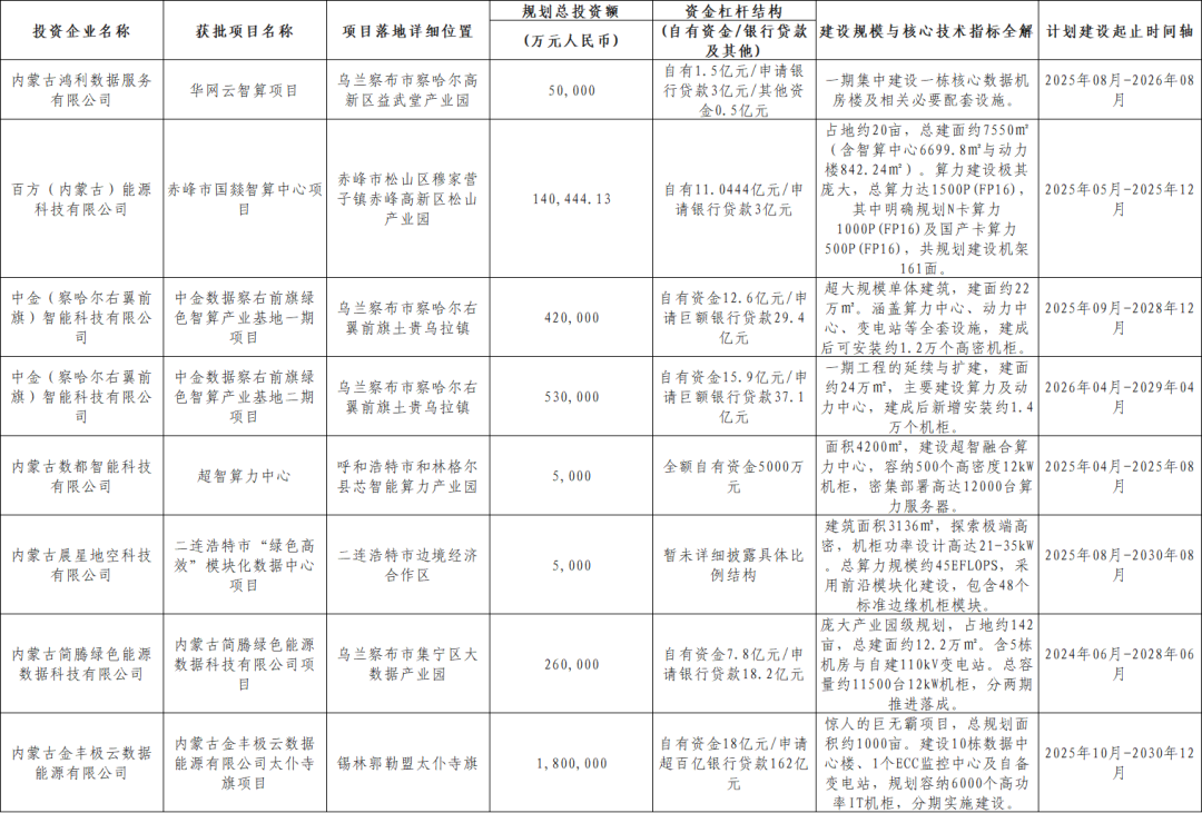 近期,內(nèi)蒙古自治區(qū)投資項目在線審批辦事大廳密集公示了多個重磅算力項目的備案辦理結(jié)果,這7個新近獲批的算力巨無霸項目總投資額合計高達約321億元人民幣。以下清單表格詳細梳理并量化了近期獲批落地內(nèi)蒙古的標志性算力企業(yè)、項目細節(jié)及核心技術(shù)指標: