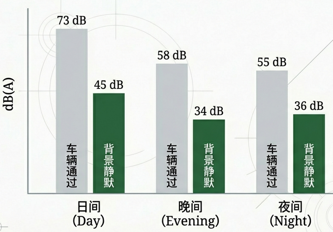 現(xiàn)有噪聲環(huán)境主要為鄉(xiāng)村特征,背景噪聲水平較低,但受到局部道路交通的間歇性影響。