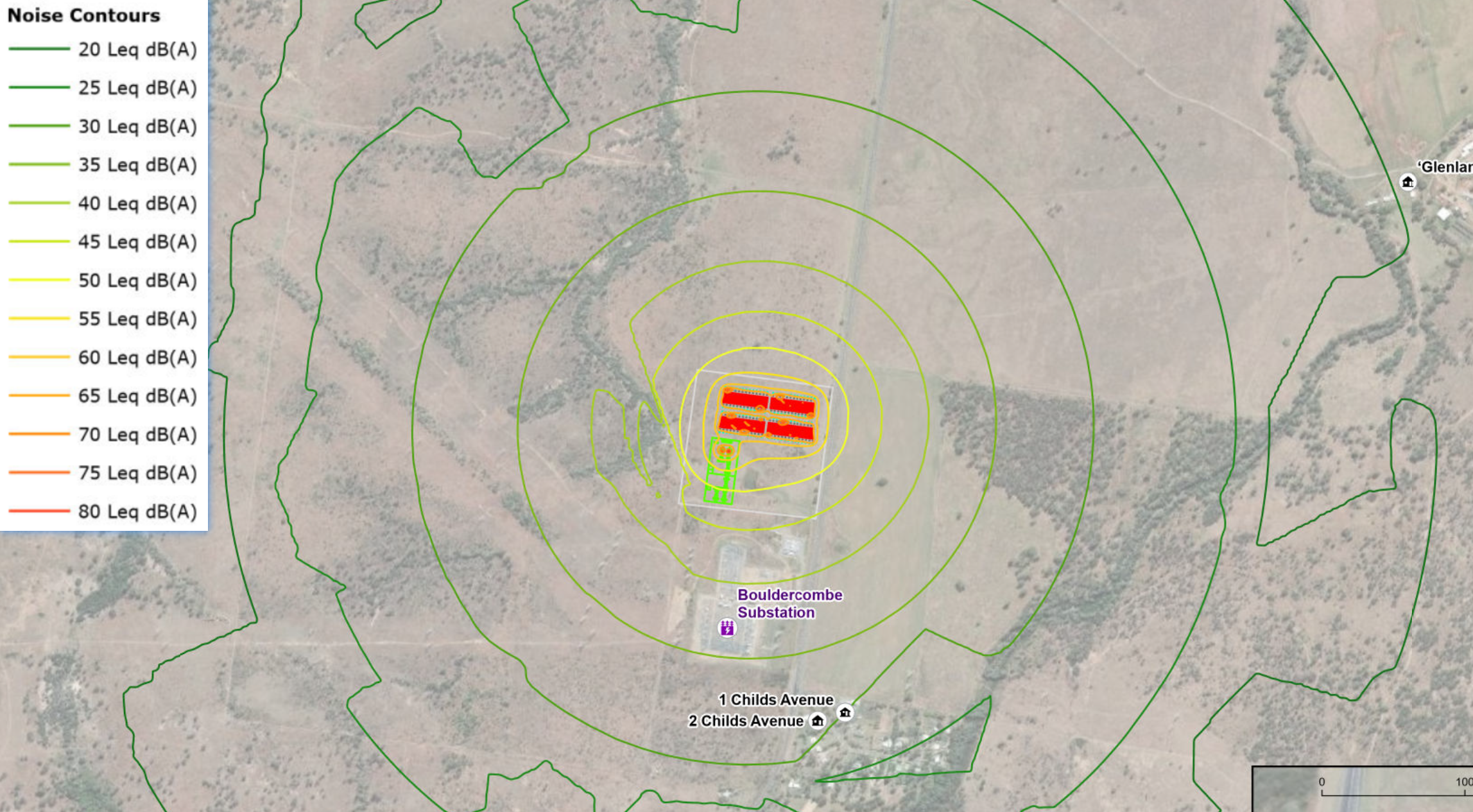 在噪聲模型和噪聲源基礎(chǔ)上,根據(jù)控制標準,預(yù)測監(jiān)測點的噪聲級,并提供出等噪聲級輪廓。如Capricorn BESS項目,基于SoundPLAN的噪聲輪廓如下: