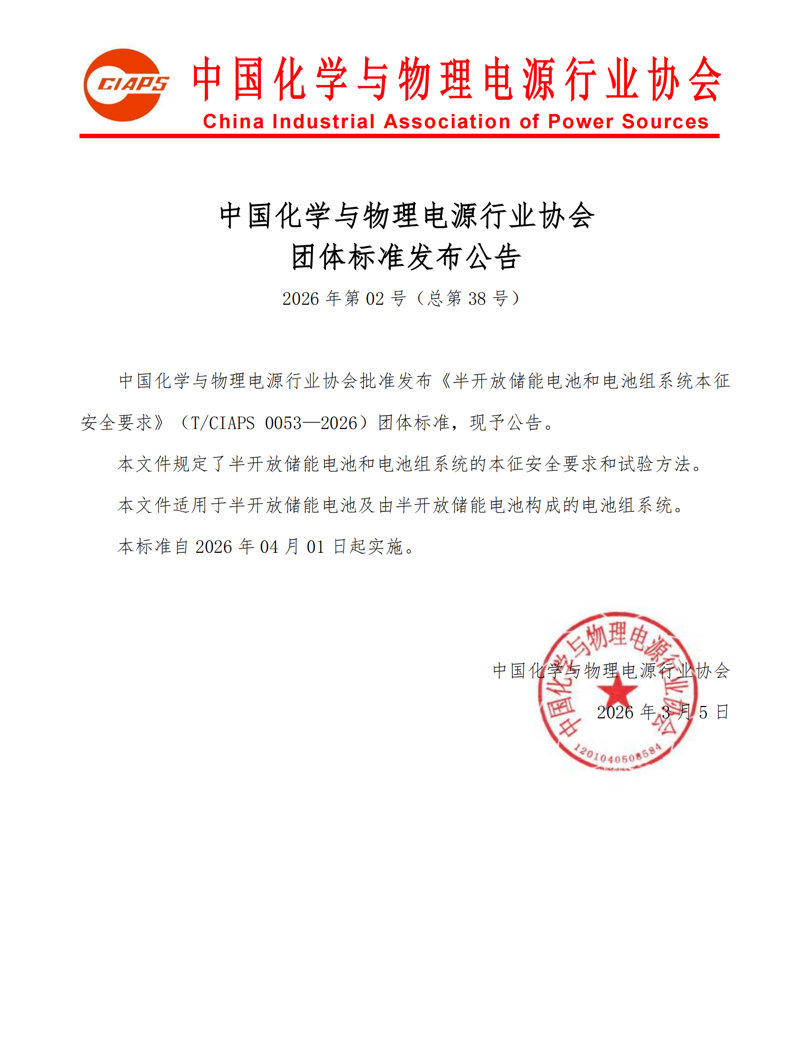 中國化學與物理電源行業(yè)協(xié)會批準發(fā)布《半開放儲能電池和電池組系統(tǒng)本征安全要求》(T/CIAPS 0053—2026)團體標準,現(xiàn)予公告。