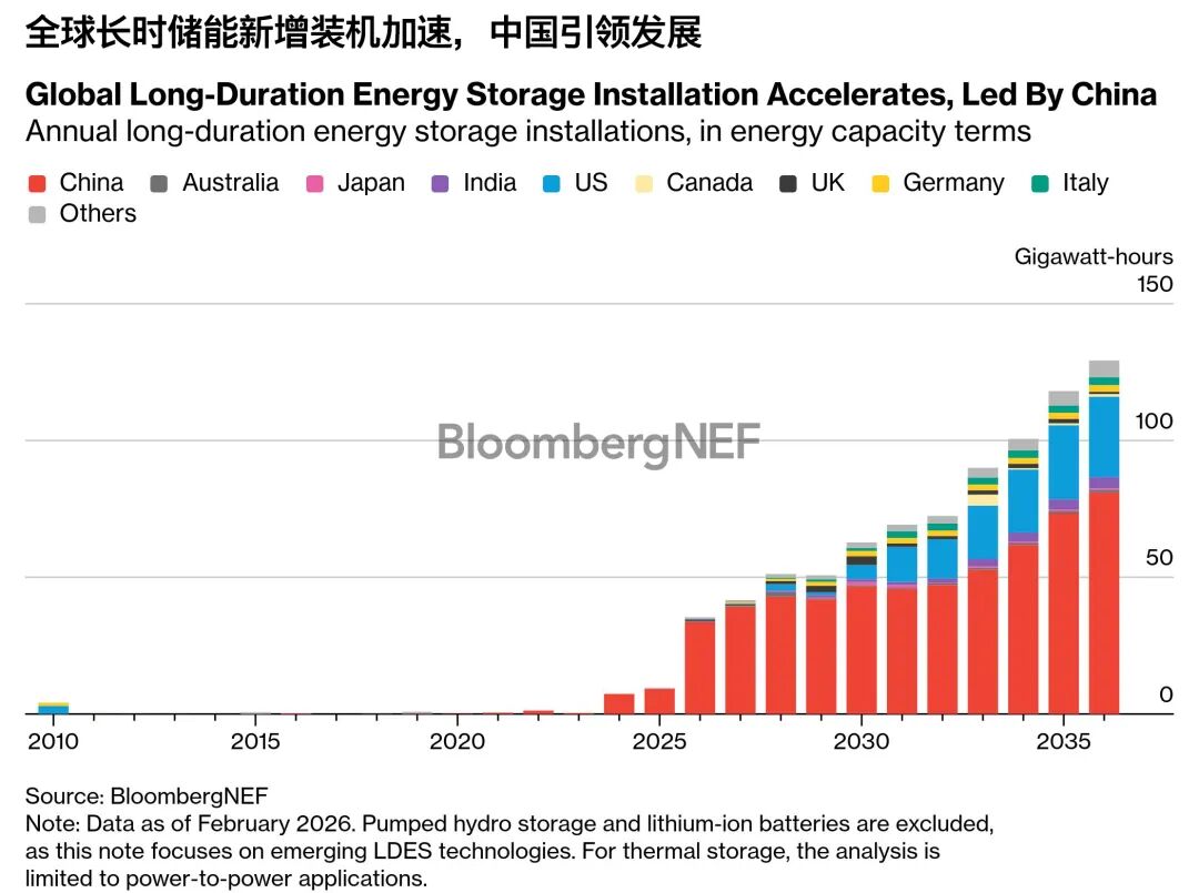 對長時儲能(LDES)而言,去年具有關(guān)鍵意義:新增裝機創(chuàng)歷史新高,儲備項目快速擴張,且越來越多的市場正加大政策支持力度。2026年新增裝機將激增至8.1GW/35.4GWh——較2025年增長近三倍,標(biāo)志著全球新增裝機的轉(zhuǎn)折點。預(yù)計到2030年,全球長時儲能年新增裝機將突破10GW,隨著技術(shù)成熟和供應(yīng)鏈規(guī)?;l(fā)展,本世紀(jì)30年代中期增速將進一步加快。