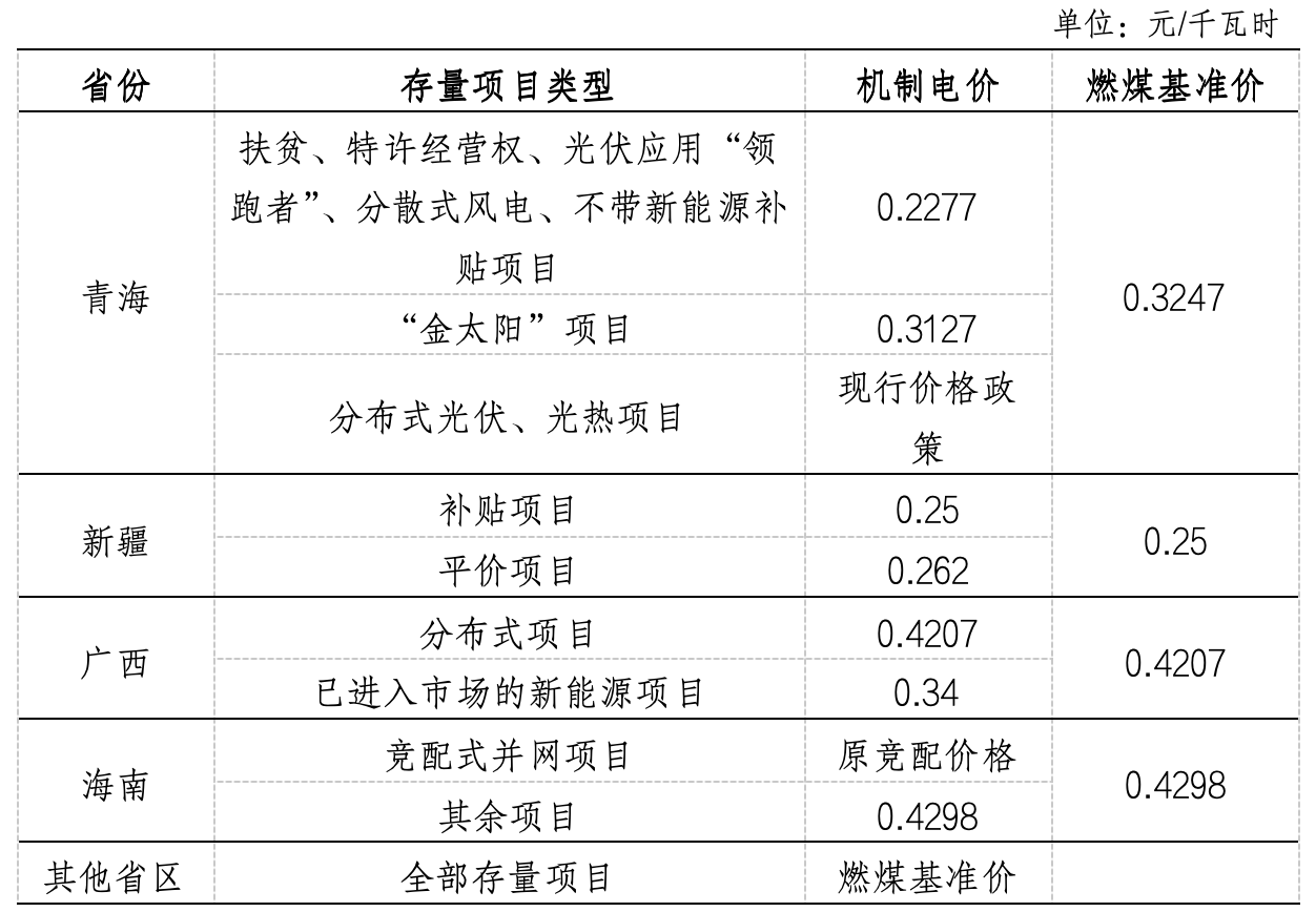 表1 各地存量項目機制電價情況