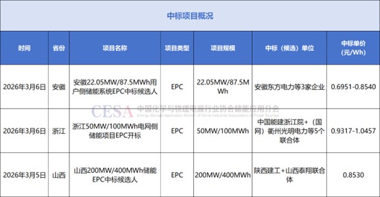 3月6日,浙江省(衢州市)常山縣何家鄉(xiāng)50MW/100MWh電網(wǎng)側(cè)儲能項目工程總承包開標。中國能建浙江院+衢州光明電力等5個聯(lián)合體投標,折合投標單價約為0.9317-1.0457元/Wh。