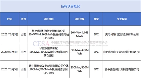 招標方面, 3個山西獨立儲能項目發(fā)布EPC招標公告,分別為:晉中疆智儲發(fā)新能源有限公司介休200MW/800MWh獨立儲能項目、華信振陽高新區(qū)200MW/400MWh獨立儲能項目、焦電(柳林縣)新能源有限公司50MW/44.168MWh獨立儲能電站建設(shè)項目。