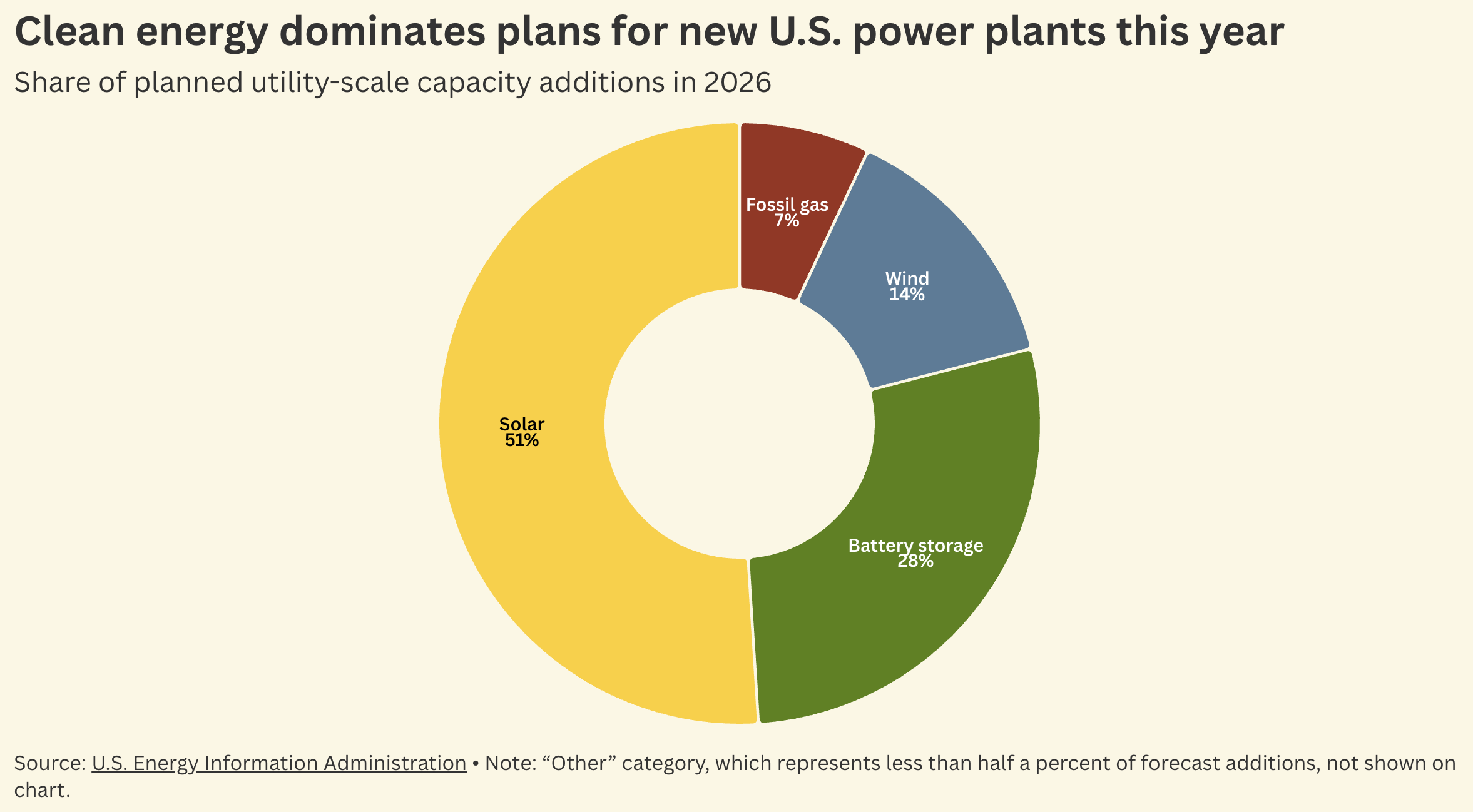 美國(guó)能源信息署的數(shù)據(jù)顯示,2026年計(jì)劃并網(wǎng)的公用事業(yè)級(jí)新增發(fā)電裝機(jī)中,太陽能占比51%,儲(chǔ)能電池占28%,風(fēng)電占14%。而特朗普政府最為支持的高污染能源——化石天然氣,其新增裝機(jī)占比僅為7%。美國(guó)白宮青睞的另一類高污染能源煤炭,甚至未出現(xiàn)在在建發(fā)電廠的名單中。