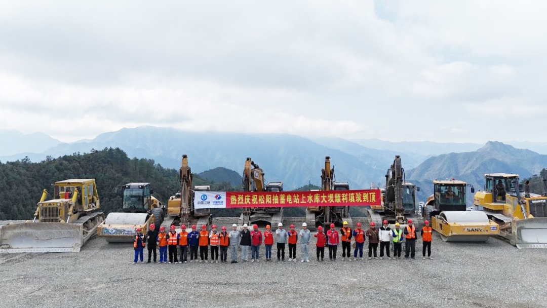 浙江松陽抽水蓄能電站上水庫主壩順利填筑到頂現(xiàn)場合影。