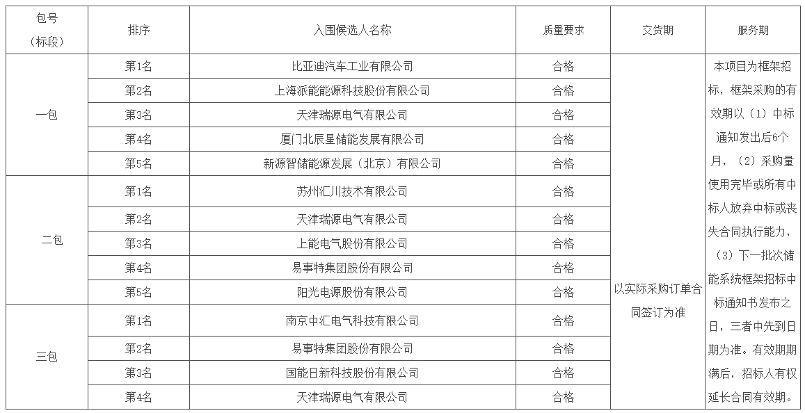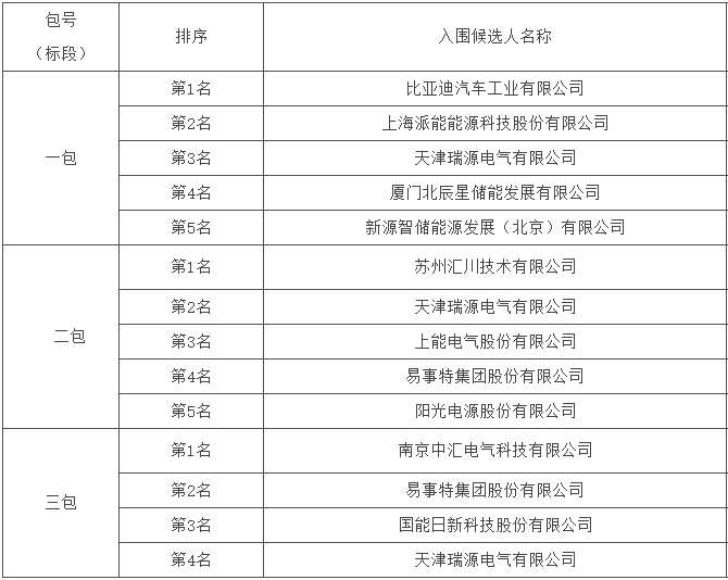 標(biāo)段一中標(biāo)候選人前五名依次為比亞迪汽車工業(yè)有限公司、上海派能能源科技股份有限公司、天津瑞源電氣有限公司、廈門北辰星儲(chǔ)能發(fā)展有限公司、新源智儲(chǔ)能源發(fā)展(北京)有限公司;