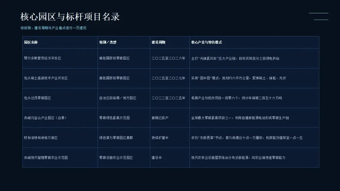 以下為目前內(nèi)蒙古全域內(nèi)已明確獲批或正在大規(guī)模實(shí)質(zhì)性建設(shè)的核心零碳園區(qū)及標(biāo)桿項(xiàng)目清單: