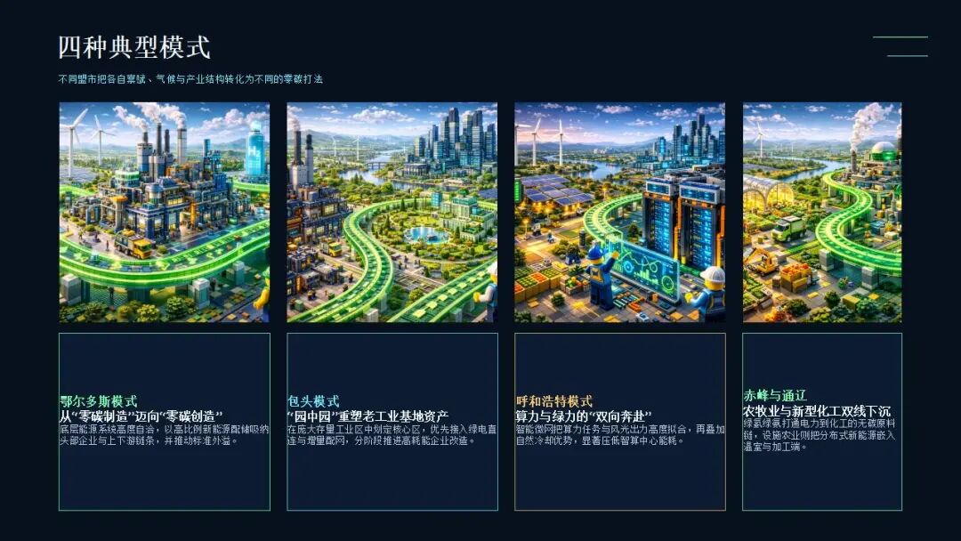 透過上述表格可以看出,內(nèi)蒙古的零碳園區(qū)絕非千篇一律的拉線供電,而是深度結(jié)合了各盟市的物理稟賦與歷史產(chǎn)業(yè)包袱,演化出了四種典型的實(shí)操模式: