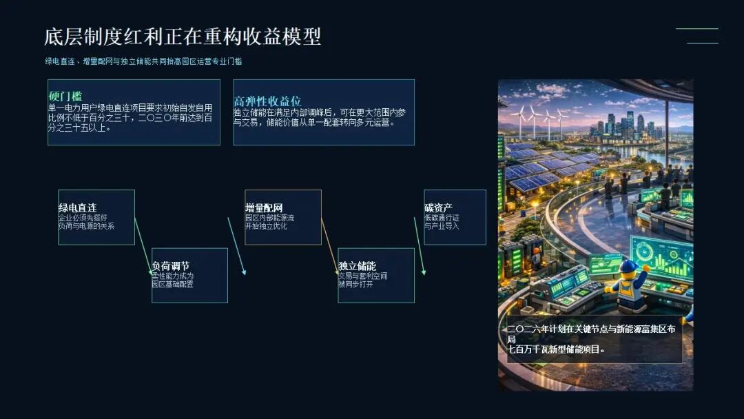 綠電直連的硬杠桿:最新印發(fā)的《單一電力用戶綠電直連項(xiàng)目開發(fā)建設(shè)實(shí)施方案》劃定了硬性門檻:新能源初始自發(fā)自用比例不得低于30%,且2030年前須達(dá)到35%以上。這強(qiáng)制園區(qū)企業(yè)必須配備強(qiáng)大的負(fù)荷調(diào)節(jié)能力。
