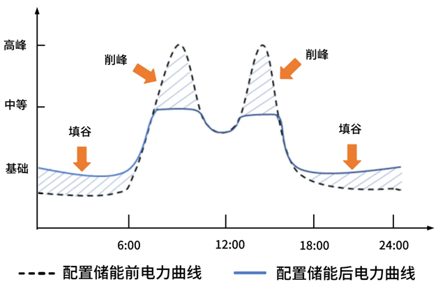 再比如,在工商業(yè)用戶端,電網(wǎng)存在峰谷電價(jià)差,儲(chǔ)能系統(tǒng)通過在電價(jià)低的谷段從電網(wǎng)充電,在電價(jià)高的峰段釋放儲(chǔ)存的電能供用戶使用,實(shí)現(xiàn)削峰填谷,降低用電成本,如下圖所示: