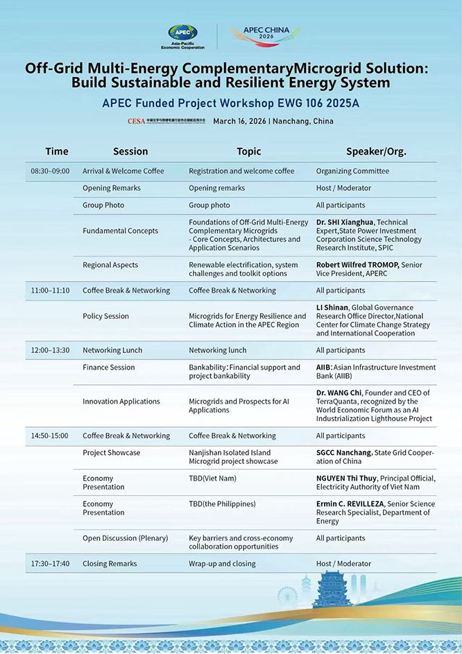 由CESA儲(chǔ)能應(yīng)用分會(huì)主辦的“多能互補(bǔ)微電網(wǎng)解決方案:以?xún)?chǔ)能為核心,構(gòu)建強(qiáng)韌性、可持續(xù)能源系統(tǒng)”專(zhuān)題研討會(huì)將于3月16日舉行。本次會(huì)議是APEC資助項(xiàng)目研討會(huì)主題會(huì)議,也是APEC“中國(guó)年”能源領(lǐng)域的第一場(chǎng)重磅活動(dòng)。