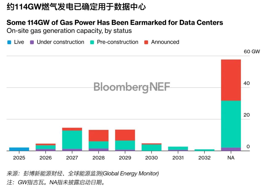 目前全球在運(yùn)數(shù)據(jù)中心現(xiàn)場(chǎng)燃?xì)獍l(fā)電裝機(jī)容量?jī)H2GW,另有7.5GW在建。其余儲(chǔ)備項(xiàng)目裝機(jī)容量達(dá)104GW,但其中僅半數(shù)具有明確投運(yùn)日期。近90%的項(xiàng)目位于美國(guó),其宣布的總裝機(jī)容量相當(dāng)于截至2025年第三季度美國(guó)數(shù)據(jù)中心IT負(fù)載儲(chǔ)備的52%。
