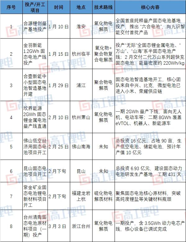 下圖是2026年以來,投產(chǎn)/開工的8個(gè)固態(tài)電池項(xiàng)目動(dòng)態(tài):