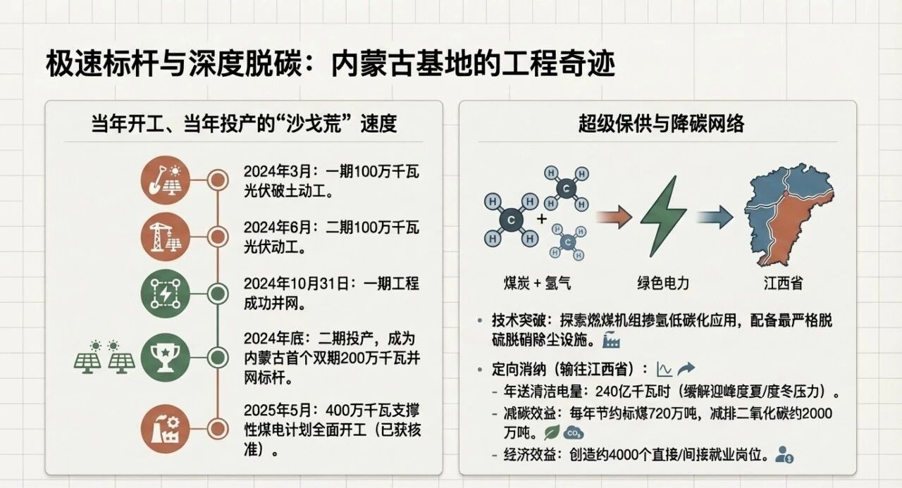 工程推進(jìn)的驚人速度:內(nèi)蒙古基地的建設(shè)進(jìn)度在同類大基地中處于絕對(duì)領(lǐng)跑地位。其光伏一期(100萬(wàn)千瓦)與二期(100萬(wàn)千瓦)項(xiàng)目分別于2024年3月和6月破土動(dòng)工。僅用了不到一年的時(shí)間,一期項(xiàng)目便于當(dāng)年10月31日成功并網(wǎng),而隨著當(dāng)年年底二期工程的投產(chǎn),該基地成為2024年內(nèi)蒙古自治區(qū)首個(gè)實(shí)現(xiàn)兩期共200萬(wàn)千瓦容量并網(wǎng)發(fā)電的“沙戈荒”工程,也是首個(gè)實(shí)現(xiàn)當(dāng)年開工、當(dāng)年投產(chǎn)的沙漠基地標(biāo)桿3。在更為復(fù)雜的支撐性煤電項(xiàng)目推進(jìn)上,其400萬(wàn)千瓦煤電項(xiàng)目已于2025年2月順利獲得內(nèi)蒙古自治區(qū)能源局的核準(zhǔn)批復(fù),并排定于2025年5月全面開工建設(shè)。
