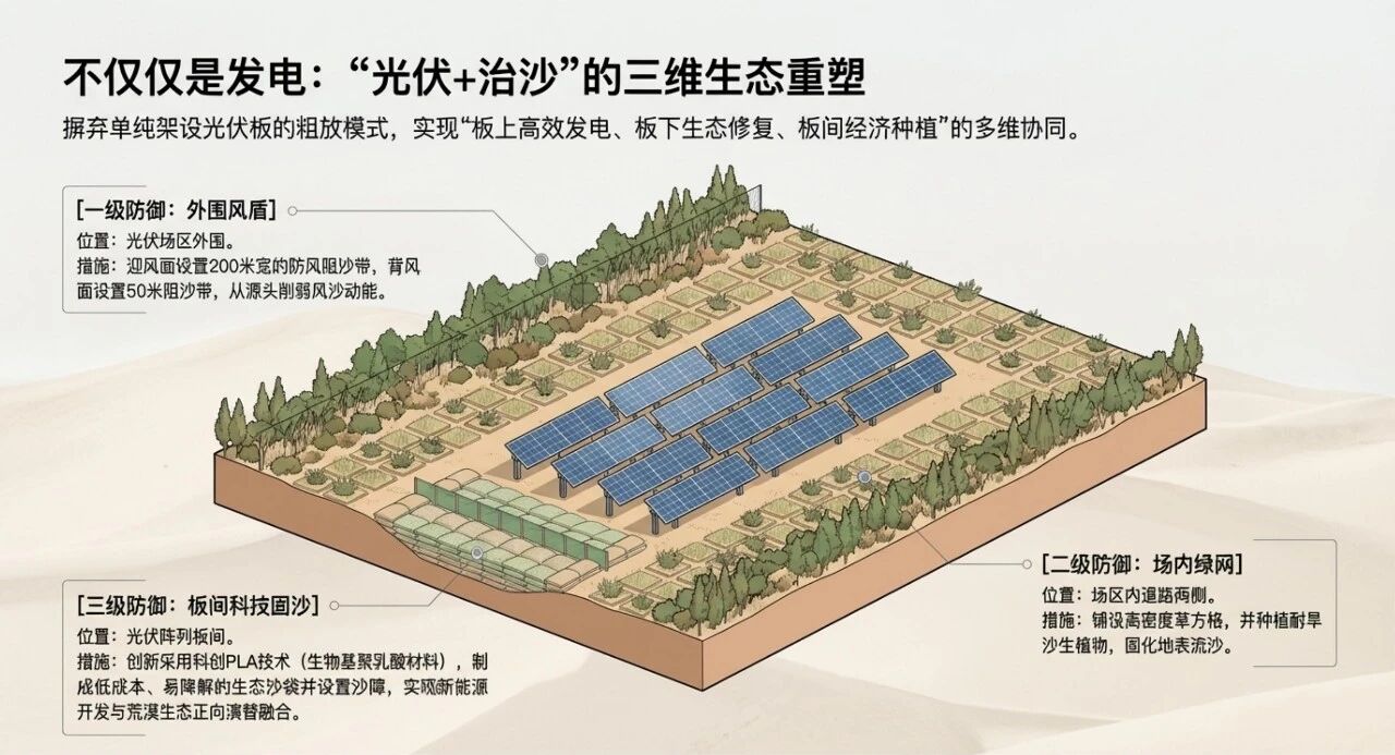 三級(jí)防御則在光伏板間創(chuàng)新采用科創(chuàng)PLA技術(shù),即利用低成本、易降解的生物基聚乳酸材料制成生態(tài)沙袋并設(shè)置沙障。這種將新能源開發(fā)與荒漠化土地生態(tài)正向演替深度融合的方案,真正走出了生態(tài)、經(jīng)濟(jì)、社會(huì)效益三贏的高質(zhì)量發(fā)展新路。