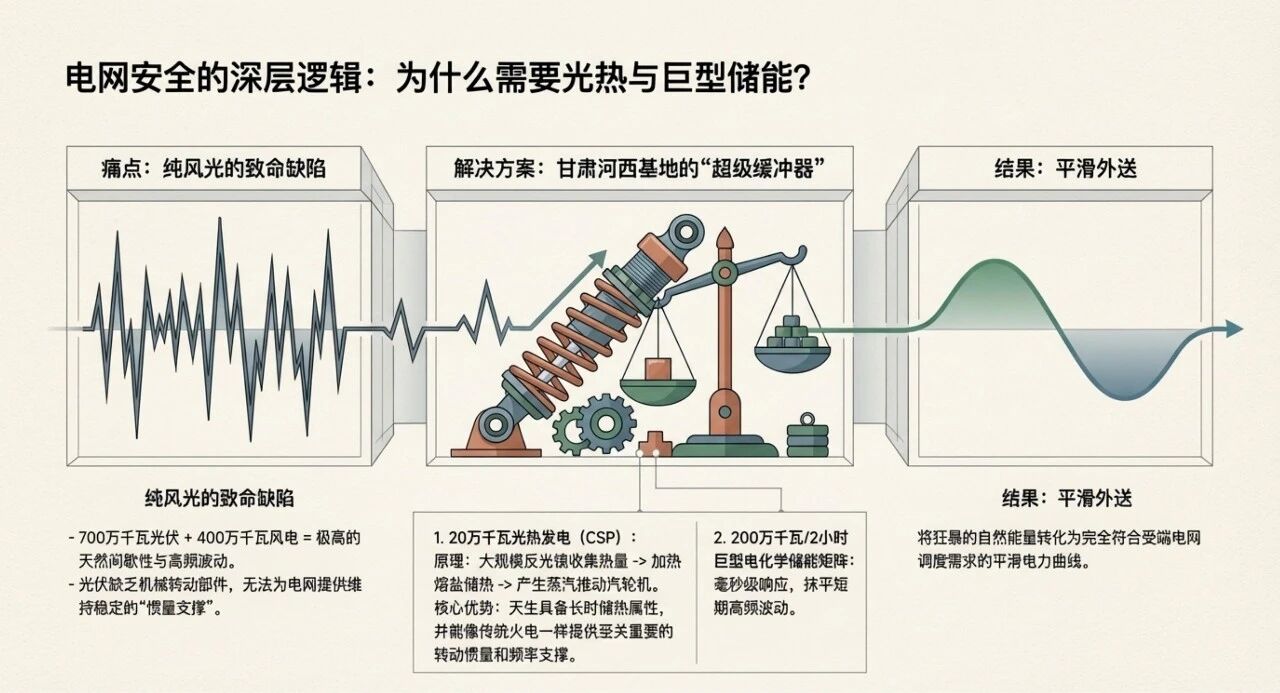 甘肅河西基地的總體規(guī)劃規(guī)模達(dá)到了1520萬(wàn)千瓦。在具體的電源陣列組合上,包含400萬(wàn)千瓦火電、400萬(wàn)千瓦風(fēng)電以及700萬(wàn)千瓦的光伏。與內(nèi)蒙古基地最為顯著的區(qū)別在于,甘肅基地在系統(tǒng)架構(gòu)中特別規(guī)劃了20萬(wàn)千瓦的光熱發(fā)電項(xiàng)目,并配備了高達(dá)200萬(wàn)千瓦/2小時(shí)的巨型新型儲(chǔ)能矩陣。