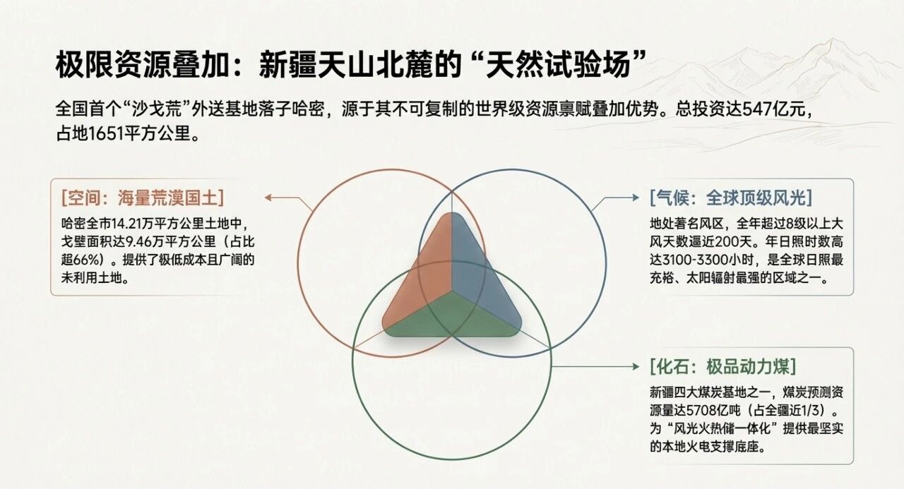 哈密還是新疆四大煤炭基地之一,煤炭預(yù)測(cè)資源量高達(dá)5708億噸,占全疆的近三分之一。這種將世界級(jí)的風(fēng)能、太陽(yáng)能與優(yōu)質(zhì)動(dòng)力煤資源高度疊加熱點(diǎn)的地理特征,使其成為布局“風(fēng)光火熱儲(chǔ)一體化”基地的絕佳天然試驗(yàn)場(chǎng)。