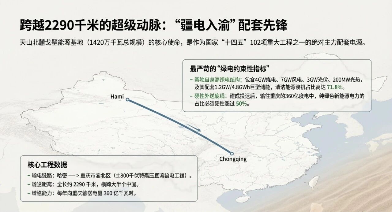 天山北麓戈壁能源基地由中國(guó)華電集團(tuán)與華潤(rùn)集團(tuán)聯(lián)合開發(fā)建設(shè),項(xiàng)目總占地面積約1651平方公里,總投資高達(dá)547億元人民幣。該基地的核心使命是作為國(guó)家“十四五”規(guī)劃102項(xiàng)重大工程之一,“疆電入渝”工程(哈密—重慶±800千伏特高壓直流輸電工程)的首批且是最核心的配套電源。
