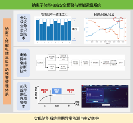 研究內(nèi)容四:通過全站級安全隱患識別技術(shù)、電池異常衰竭故障診斷技術(shù)和熱失控早期預(yù)警技術(shù),首創(chuàng)鈉離子儲能電站三級主動預(yù)警管理體系,實現(xiàn)儲能系統(tǒng)早期異常監(jiān)測和主動防護。