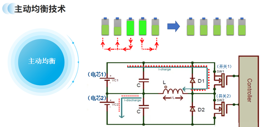 主動均衡策略,一個電池的多余電荷被轉移到另一個低電荷的電池上,從而使兩者達到平衡,這主要是利用電容器和電感器等電荷存儲元件來實現(xiàn)。在這種方法中,開關電路由降壓升壓轉換器組成,高壓電池的電荷被泵入電感器,然后通過降壓升壓轉換器釋放到低壓電池中,即電荷只能從較高的電池單元轉移到較低的電池單元。通過這種技術策略,使電芯電壓保持一致性偏差有效縮小,達到國標要求,還可避免“木桶效應”引發(fā)的熱失控。