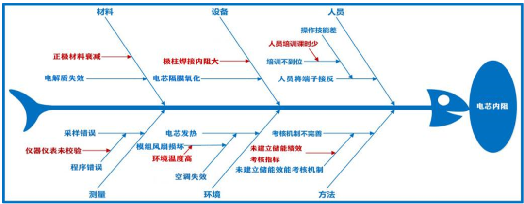 ③采用頭腦風暴的方法,從“人、機、料、法、環(huán)、測”(5M1E)六個方面對電池模組電芯內阻問題產生的原因進行分析,并繪制了因果圖。