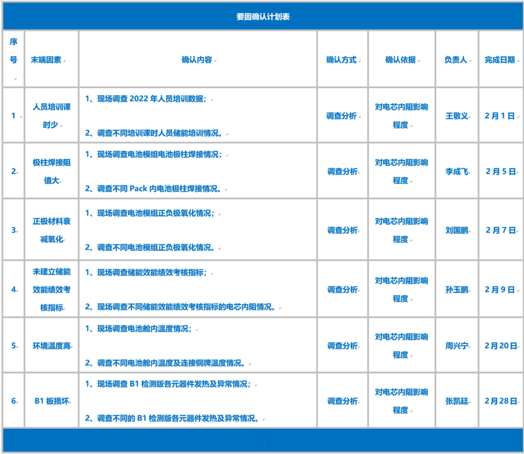 由排列圖可知,電芯內阻占比79.76%,因此,小組成員對電芯內阻進行進一步調查論證。由分析可知,電芯內阻占比92.54%,因此,電芯內阻是造成活動前的儲能電池模組電芯電壓一致性合格率低的主要癥結區(qū)域。儲能項目的電池模組電芯電壓一致性合格率為95.91%,大于 95.00%,并且電池電芯內阻最大數(shù)量為 19 個,為完成目標找到了橫向依據。只要吸收其先進經驗,通過小組成員的努力,具備達到目標值的能力。