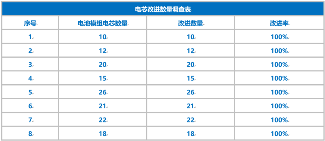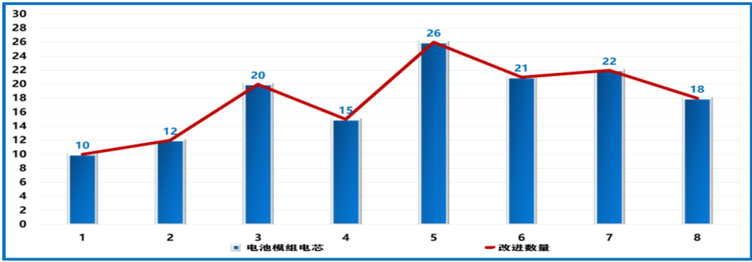 ⑥效果驗證。實施后,小組對不同集裝箱電池模組改進數(shù)量進行了調查,從調查表和柱狀圖中可以看出,對策實施后,電池模組電芯改進率達到100%,達到了對策目標,對策有效。