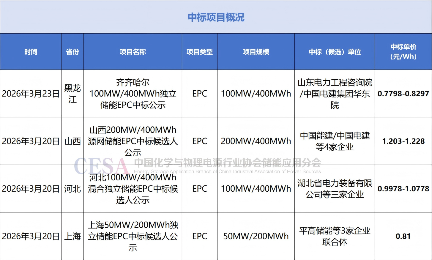 中標(biāo)方面, 3月23日,齊齊哈爾100MW/400MWh獨立新型儲能EPC總承包中標(biāo)候選人公示,山東電力工程咨詢院/中國電建集團(tuán)華東勘測設(shè)計研究院等2家投標(biāo)人入圍,投標(biāo)單價約為0.7798-0.8297元/Wh;3月20日,山西源網(wǎng)儲能、智慧電網(wǎng)建設(shè)項目EPC總承包中標(biāo)候選人公示,中國能源建設(shè)集團(tuán)山西電力建設(shè)第三有限公司/中國電建集團(tuán)海南電力設(shè)計研究院有限公司為第一中標(biāo)候選人,投標(biāo)單價約合1.203元/Wh;河北定興縣100MW/400MWh混合獨立儲能EPC中標(biāo)候選人公示,湖北省電力裝備有限公司等3家企業(yè)入圍,中標(biāo)單價區(qū)間0.9978-1.0778元/Wh。