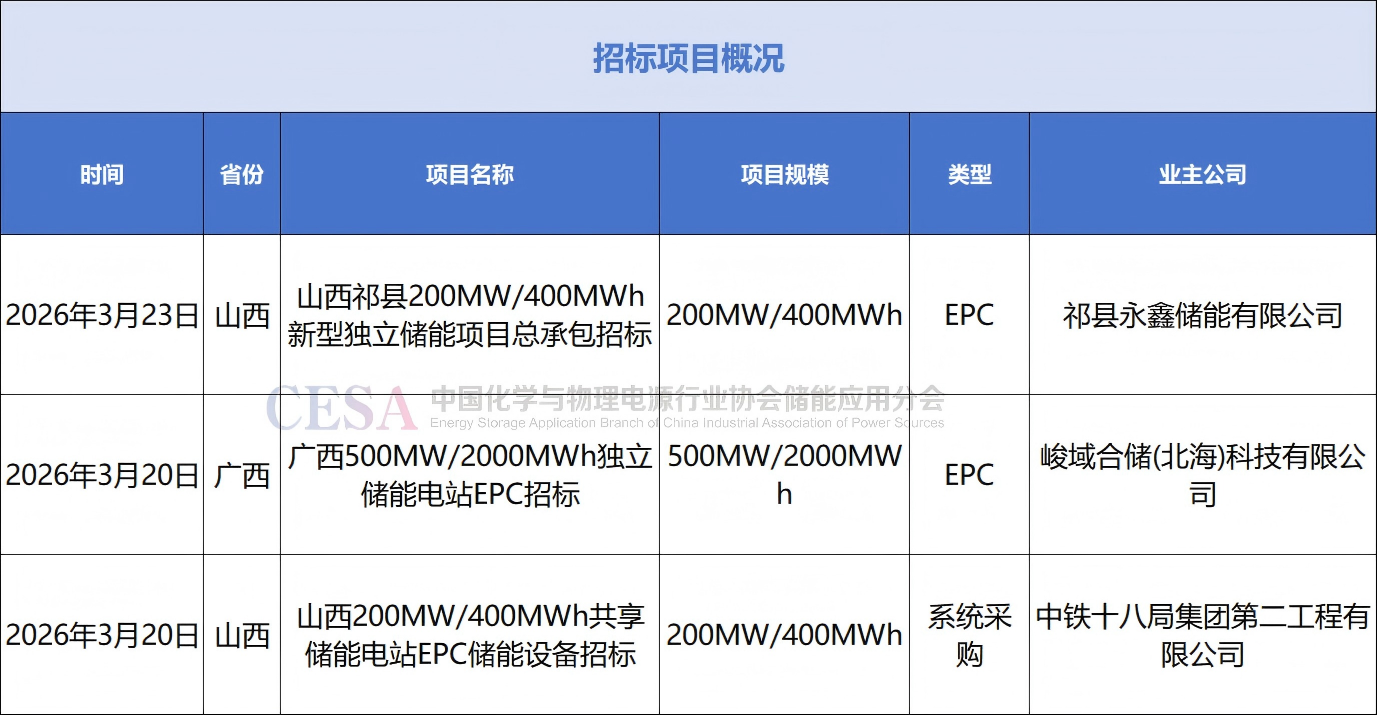 招標(biāo)方面, 3月20日,廣西北海鐵山東港產(chǎn)業(yè)園峻域數(shù)字能源一期項目500MW/2000MWh獨立儲能電站工程總承包招標(biāo);山西祁縣200MW/400MWh新型獨立儲能EPC公開招標(biāo),中鐵十八局集團(tuán)第二工程有限公司臨環(huán)峰200MW/400MWh共享儲能電站EPC總承包項目部儲能設(shè)備招標(biāo)。