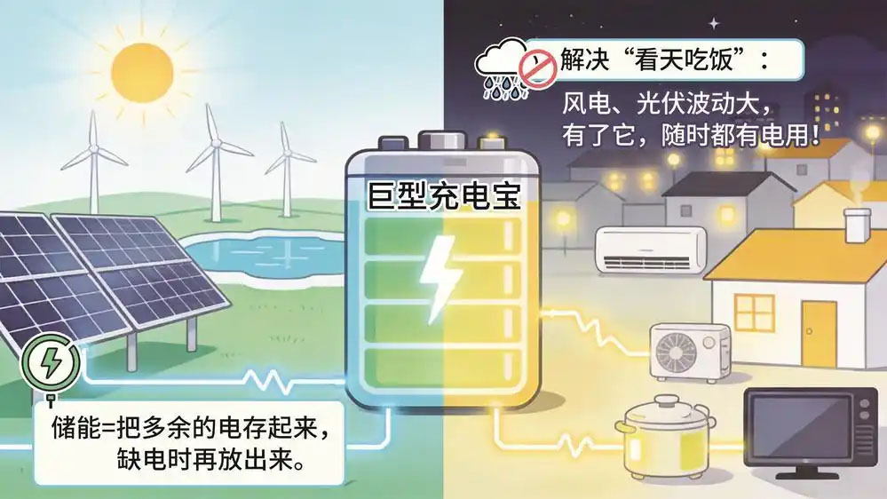 儲能的作用,就像一個“時間搬運工”。把白天用不完的太陽光“搬”到晚上用,把大風天多發(fā)的電“存”到?jīng)]風的時候用。