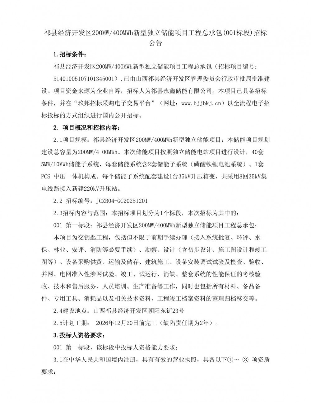 中國儲能網(wǎng)訊:3月23日,祁縣經(jīng)濟開發(fā)區(qū)200MW/400MWh新型獨立儲能項目工程總承包(001標段)招標公告發(fā)布。