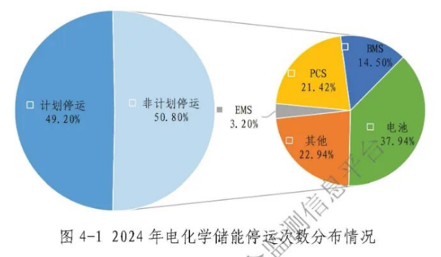 在非計(jì)劃停運(yùn)原因中,PCS導(dǎo)致停運(yùn)的占比高達(dá)32.21%,較2024年的21.42%比例提高了近11個(gè)百分點(diǎn),成為非計(jì)劃停運(yùn)最主要的原因;相比之下,2024年非計(jì)劃停運(yùn)原因占比最高的電池占比從2024年的37.94%降至2025年的22.89%。