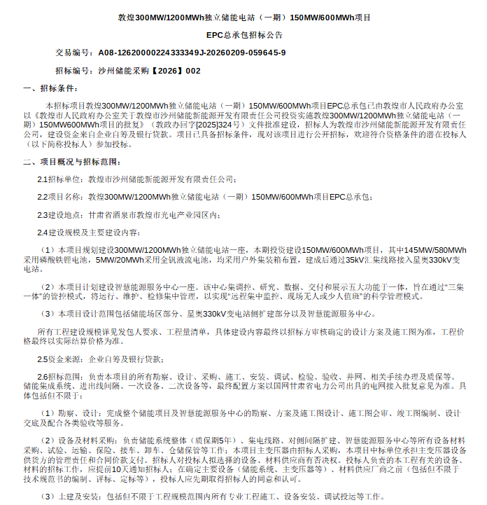 中國(guó)儲(chǔ)能網(wǎng)訊:3月24日,敦煌市沙州儲(chǔ)能新能源開(kāi)發(fā)有限責(zé)任公司發(fā)布敦煌30MW/1200MWh獨(dú)立儲(chǔ)能電站(一期)150MW/600MWh項(xiàng)目EPC總承包招標(biāo)公告。