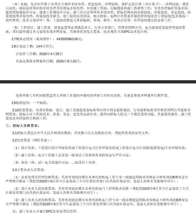 項(xiàng)目概算總投資(最高限價(jià))為463,505,983.00元,計(jì)劃工期144日歷天。計(jì)劃開(kāi)工日期為2026年4月25日,全容量并網(wǎng)節(jié)點(diǎn)為2026年9月15日。