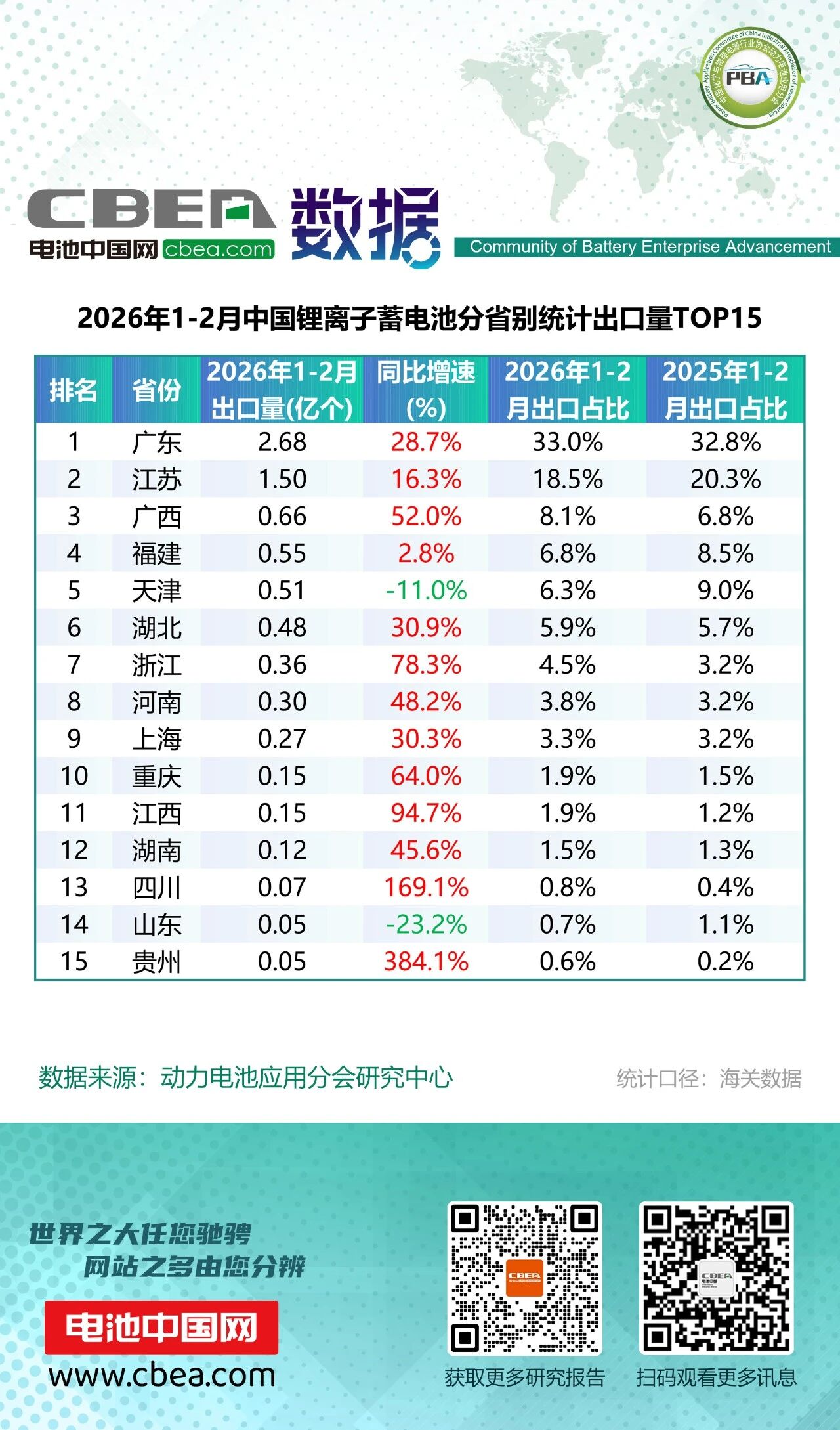 中國儲能網(wǎng)訊:2026年1-2月,中國鋰離子蓄電池出口總量達8.11億個,同比增長27.8%,整體呈現(xiàn)增長態(tài)勢。廣東以2.68億個的出口量穩(wěn)居榜首,占比達33.0%,繼續(xù)保持全國鋰電出口的絕對核心地位。江蘇以1.50億個位列第二,兩省合計貢獻了全國超一半的出口份額。廣西憑借52.0%的同比增速超越福建,躍居第三位。
