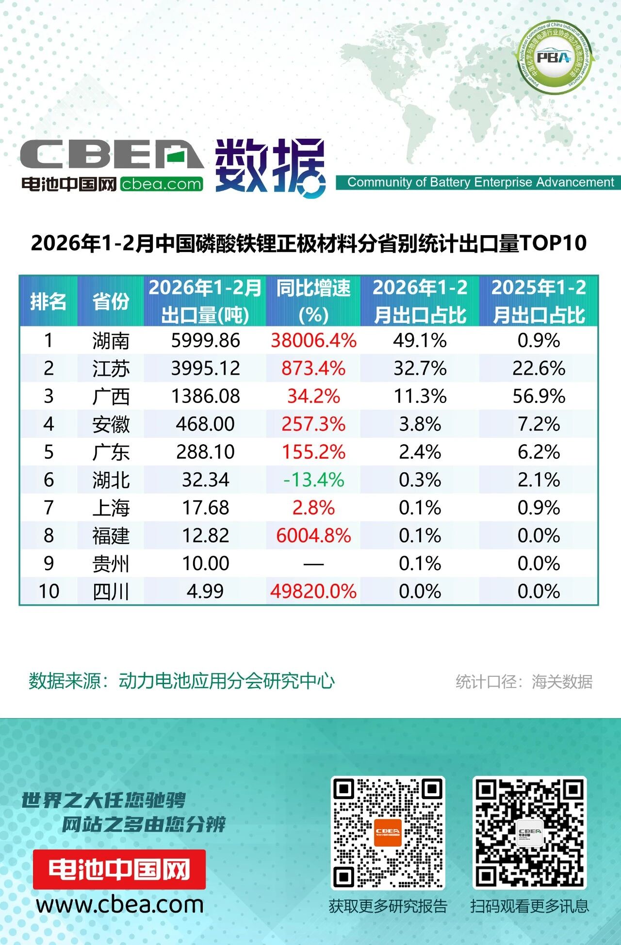 磷酸鐵鋰正極材料出口1.22萬噸,同比增長572.3%。湖南異軍突起,以5999.86噸的出口量、38006.4%的驚人增速躍居全國首位,出口占比從去年同期的0.9%飆升至49.1%,成為我國磷酸鐵鋰出口的絕對龍頭。江蘇穩(wěn)居第二,出口量3995.12噸,同比增長873.4%,占比由22.6%提升至32.7%,兩省合計貢獻了全國超八成的出口量。
