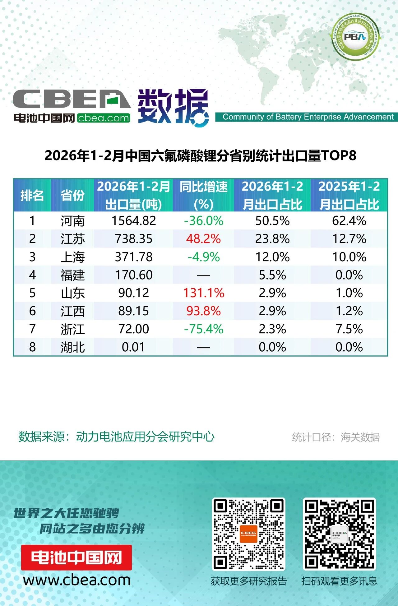 六氟磷酸鋰出口3096.83噸,同比下降20.9%。呈現(xiàn)"頭部集中、區(qū)域分化"特征。河南繼續(xù)穩(wěn)居全國首位,出口量1564.82噸,占全國比重50.5%,但同比下滑36.0%,占比由去年同期的62.4%明顯回落,顯示其主導地位有所松動。江蘇表現(xiàn)強勁,出口量738.35噸,同比增長48.2%,占比由12.7%提升至23.8%,穩(wěn)居次席。