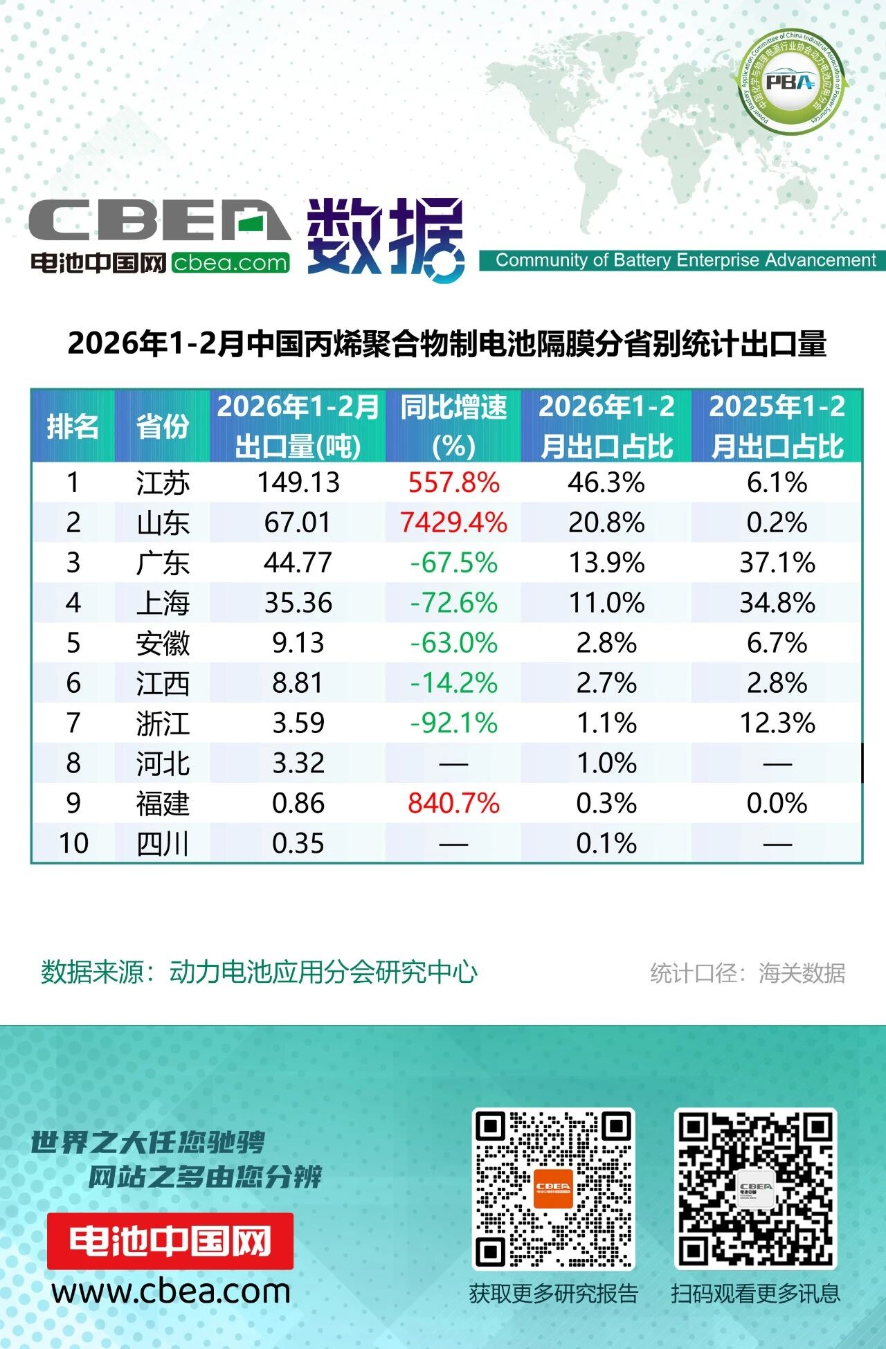 丙烯聚合物制電池隔膜出口322.36噸,同比下降13.1%。江蘇異軍突起,以149.13噸的出口量、557.8%的同比增速躍居全國首位,占比從去年同期的6.1%飆升至46.3%,成為電池隔膜出口的新龍頭。山東同樣表現(xiàn)搶眼,出口量67.01噸,同比激增7429.4%,占比由0.2%提升至20.8%,躍居第二。