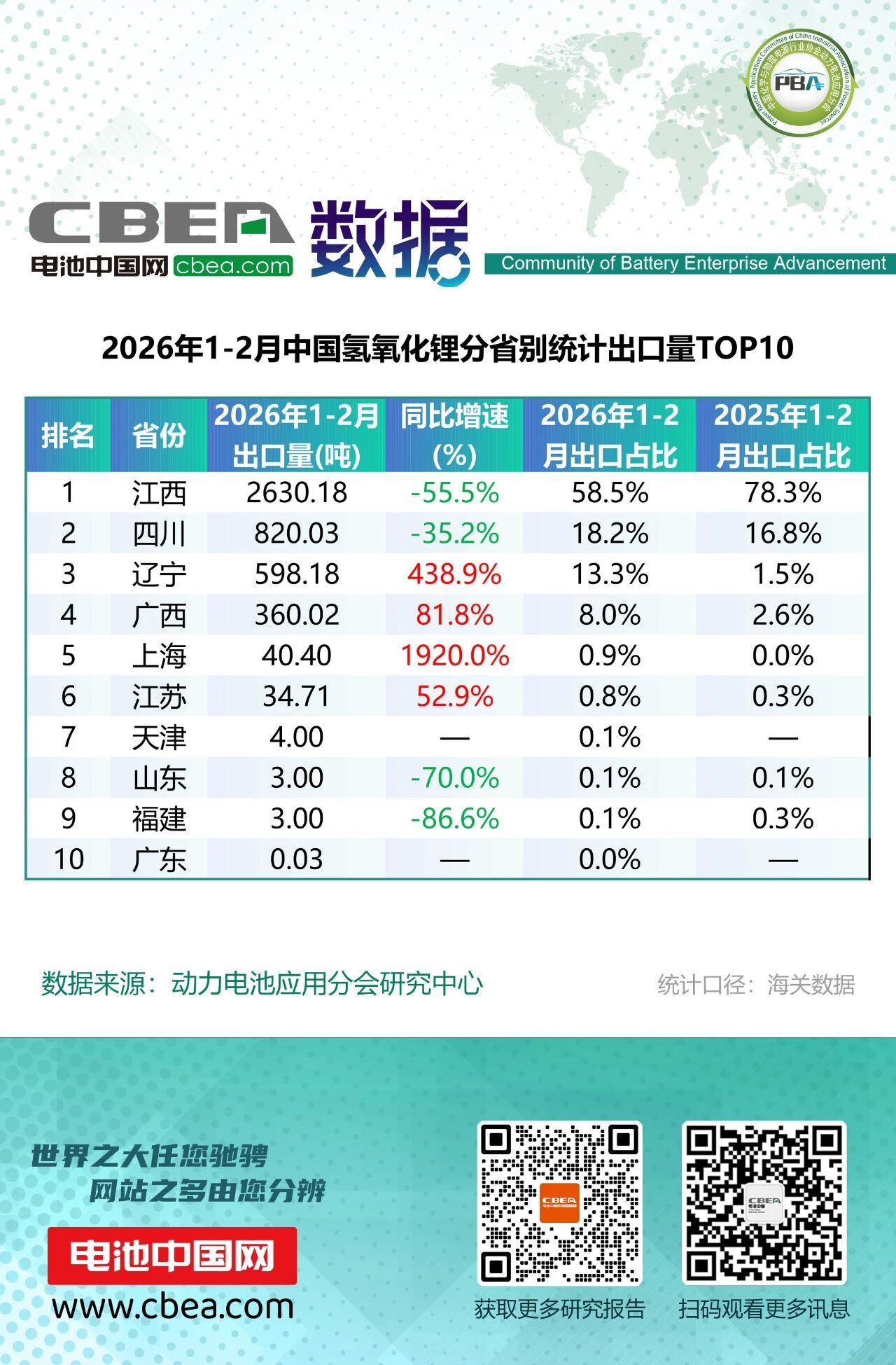 氫氧化鋰出口4493.54噸,同比下降40.4%。江西雖繼續(xù)穩(wěn)居全國首位,出口量2630.18噸,占全國比重58.5%,但同比大幅下滑55.5%,占比由去年同期的78.3%明顯回落,主導地位有所松動。從增長亮點看,遼寧表現(xiàn)最為突出,出口量598.18噸,同比激增438.9%,占比由1.5%躍升至13.3%,躋身前三。