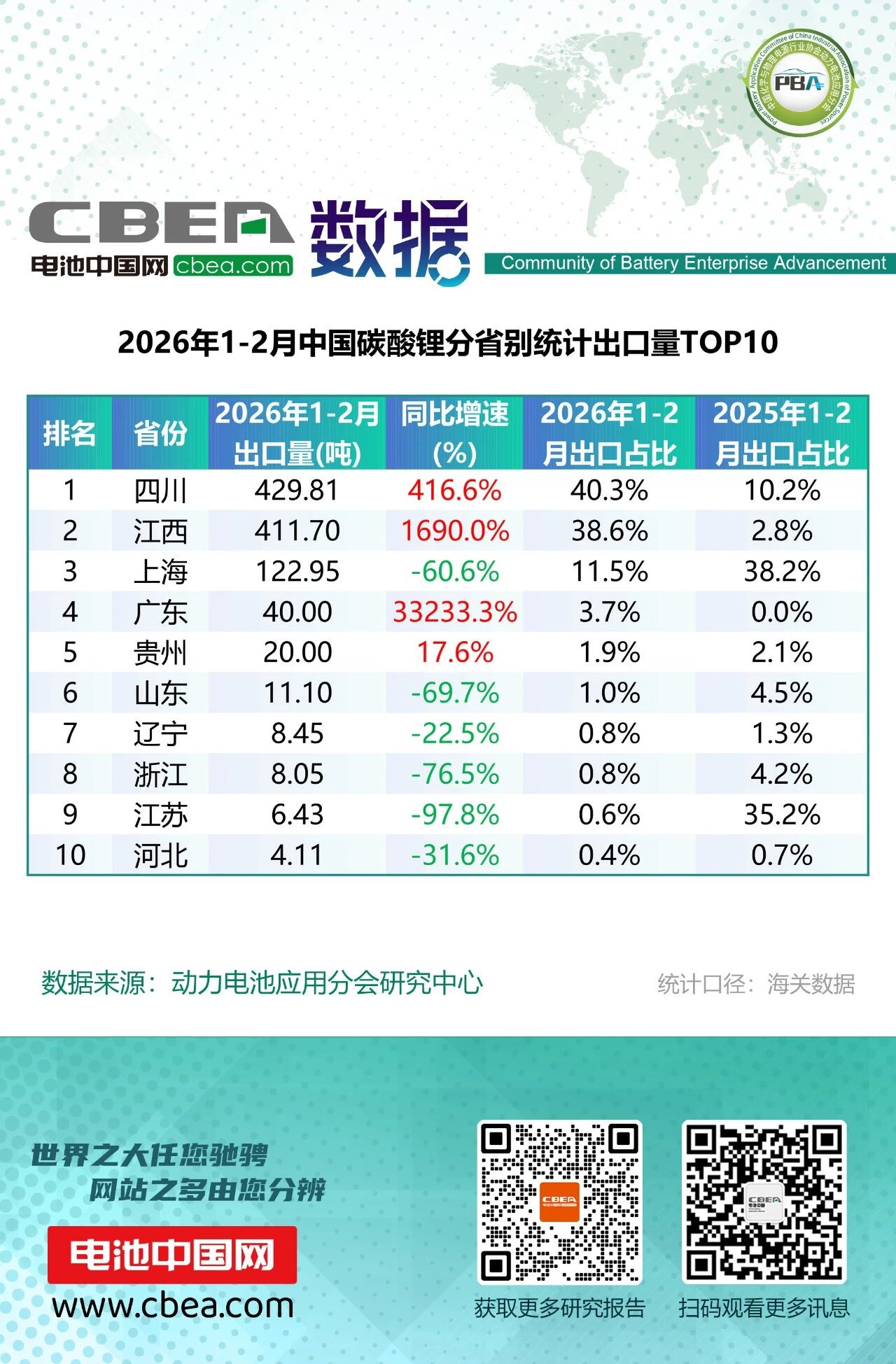 碳酸鋰出口1067.64噸,同比增長30.9%。四川躍居全國首位,出口量429.81噸,同比增長416.6%,占比由去年同期的10.2%大幅提升至40.3%。江西緊隨其后,出口量411.70噸,同比激增1690.0%,占比由2.8%飆升至38.6%。