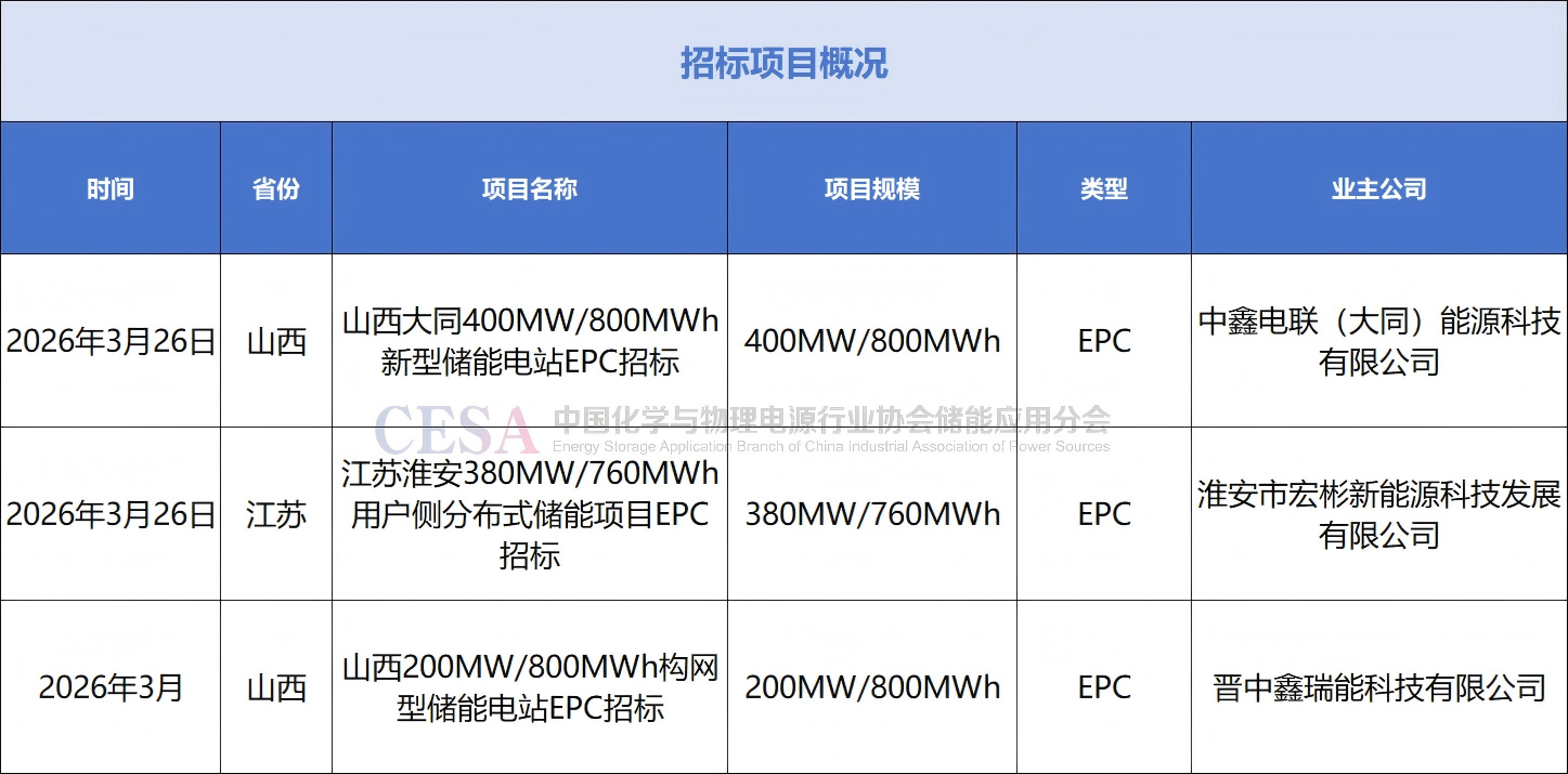 招標(biāo)方面,3月26日,山西大同400MW/800MWh新型儲能EPC總承包招標(biāo)公告發(fā)布;江蘇淮安380MW/760MWh用戶側(cè)分布式儲能EPC招標(biāo)公告發(fā)布;山西晉中和順200MW/800MWh共享構(gòu)網(wǎng)型儲能電站項目EPC發(fā)布招標(biāo)公告。