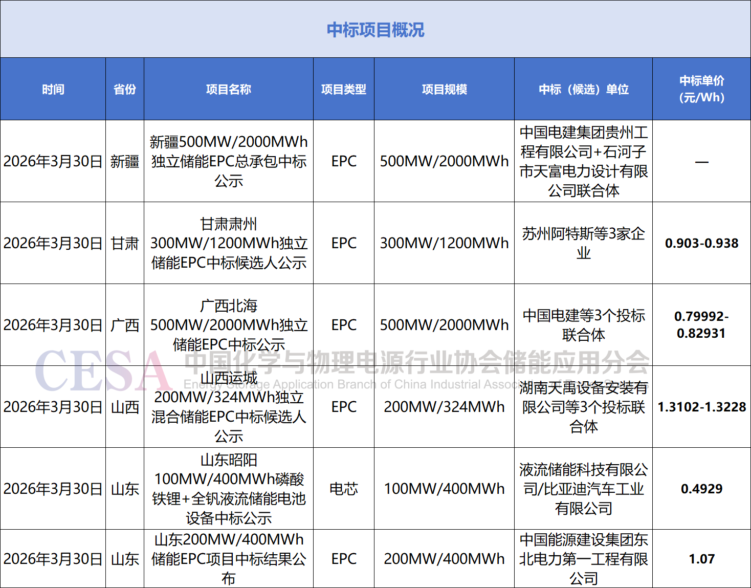 中標(biāo)方面, 3月30日,甘肅肅州區(qū)300MW/1200MWh獨(dú)立儲能電站項目EPC中標(biāo)候選人公示,蘇州阿特斯等3家企業(yè)入圍,中標(biāo)單價區(qū)間0.903-0.938元/Wh;廣西北海500MW/2000MWh獨(dú)立儲能EPC中標(biāo)候選人公示,中國電建集團(tuán)牽頭的3個投標(biāo)聯(lián)合體入圍,投標(biāo)單價區(qū)間0.79992-0.82931元/Wh;山西運(yùn)城市森儲能源科技有限公司新建200MW/324MWh獨(dú)立混合儲能EPC中標(biāo)候選人公示,湖南天禹設(shè)備安裝有限公司等3個投標(biāo)聯(lián)合體入圍,投標(biāo)單價約為1.3102-1.3228元/Wh。