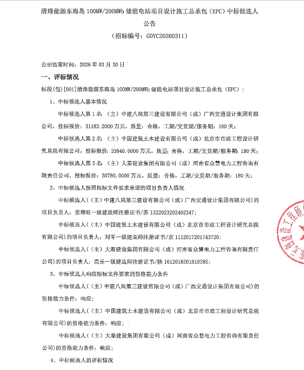 中國儲能網(wǎng)訊:3月25日,清烽能源東海島100MW/200MWh儲能電站項目設(shè)計施工總承包(EPC)中標(biāo)候選人正式公示。