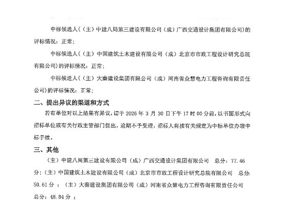 第一中標(biāo)候選人:中建八局第三建設(shè)有限公司與廣西交通設(shè)計集團(tuán)有限公司聯(lián)合體,報價31183.2萬元,折合單價約1.5592元/Wh;