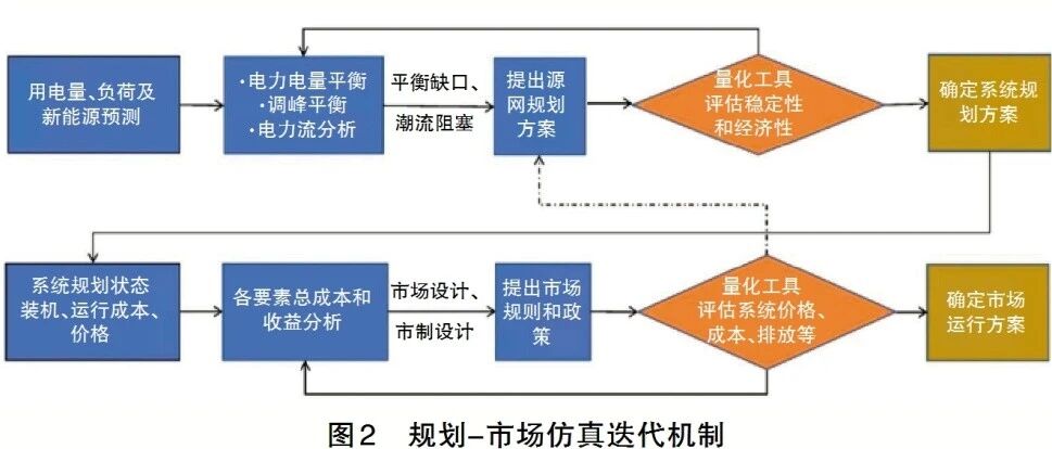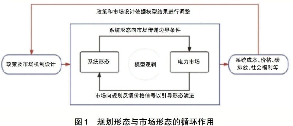 新型電力系統(tǒng)的構(gòu)建,經(jīng)濟(jì)問題的核心在于如何以最低的轉(zhuǎn)型成本實(shí)現(xiàn)能源結(jié)構(gòu)的優(yōu)化,并建立合理的成本疏導(dǎo)與分?jǐn)倷C(jī)制,確保各環(huán)節(jié)主體的可持續(xù)參與。將市場(chǎng)信號(hào)轉(zhuǎn)化為規(guī)劃決策,需要工具支撐。規(guī)劃-市場(chǎng)一體化聯(lián)合仿真平臺(tái),正是連接二者的橋梁,也是量化評(píng)估轉(zhuǎn)型成本、驗(yàn)證疏導(dǎo)路徑有效性的關(guān)鍵手段。規(guī)劃形態(tài)與市場(chǎng)形態(tài)的循環(huán)作用體現(xiàn)在內(nèi)外循環(huán)兩個(gè)方面:內(nèi)循環(huán),規(guī)劃形態(tài)決定市場(chǎng)形態(tài),市場(chǎng)運(yùn)行引導(dǎo)規(guī)劃發(fā)展;外循環(huán),政策機(jī)制決定規(guī)劃和市場(chǎng)形態(tài),規(guī)劃和市場(chǎng)運(yùn)行引導(dǎo)政策機(jī)制制定(見圖1)。