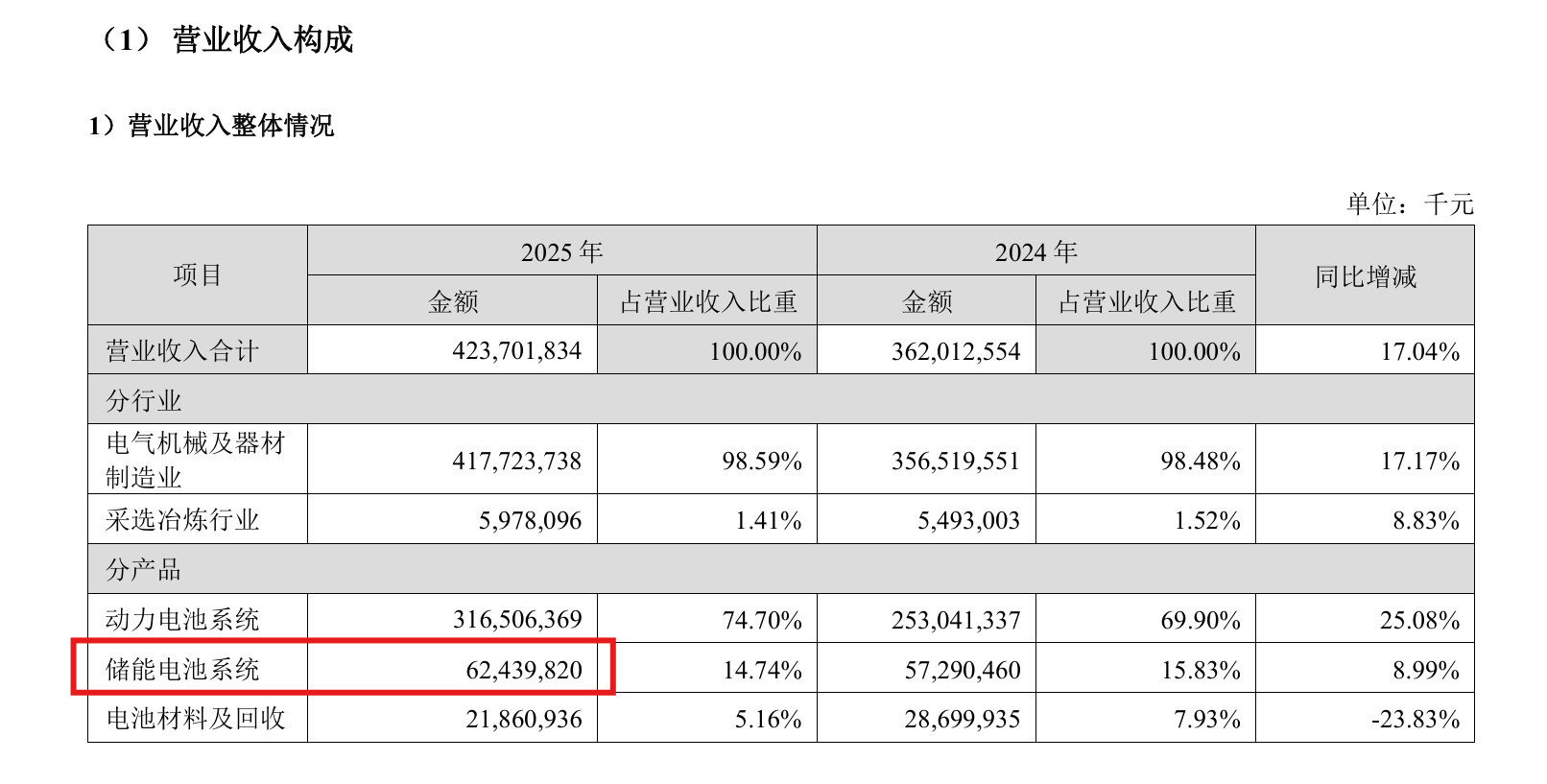 其中,儲(chǔ)能電池系統(tǒng)2025年?duì)I收624.40億元,營(yíng)收規(guī)模同比增加8.99%,占總營(yíng)收14.74%。