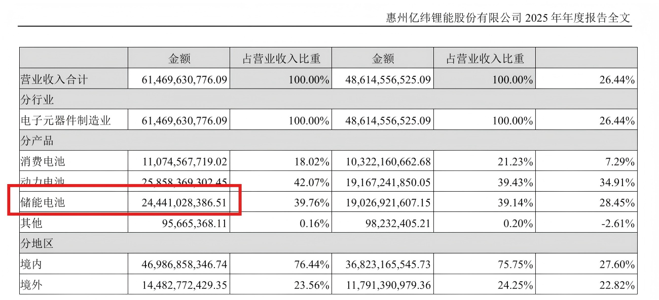 億緯鋰能2025年?duì)I業(yè)總收入614.70億元,同比增長(zhǎng)26.44%。其中,儲(chǔ)能電池營(yíng)收244.41億元,同比增長(zhǎng)28.45%。報(bào)告期內(nèi),億緯鋰能儲(chǔ)能電池出貨 71.05GWh,同比增長(zhǎng)40.84%。